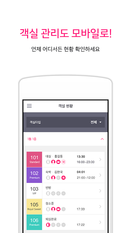 예약관리, 고객소통, 광고현황확인, 객실관리, 룸서비스요청 관리까지