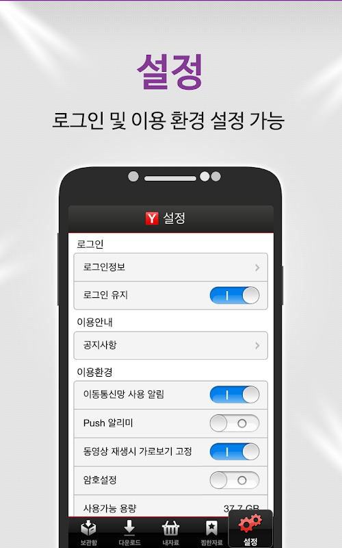 구매자료(인기자료, 영화, 동영상, 드라마, 교육, 애니, 유아)를 앱에서 다운로드 할 수 있습니다.