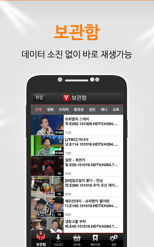 최신영화, 드라마, 애니, 동영상, 만화, 음악 등 다운로드 전용 무료앱 입니다.