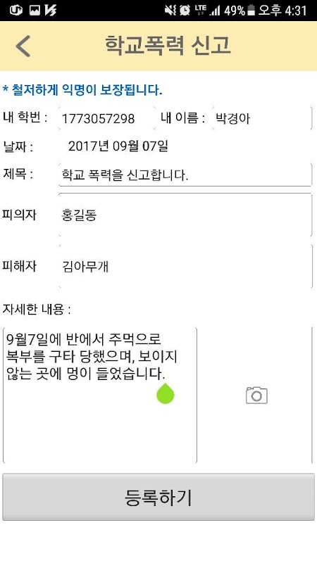 하지만 이 앱에서는 손쉽게 학교폭력에 대한 신고를 할 수 있으며, 신고자에 대한 정보는 확실하게 보호됩니다.