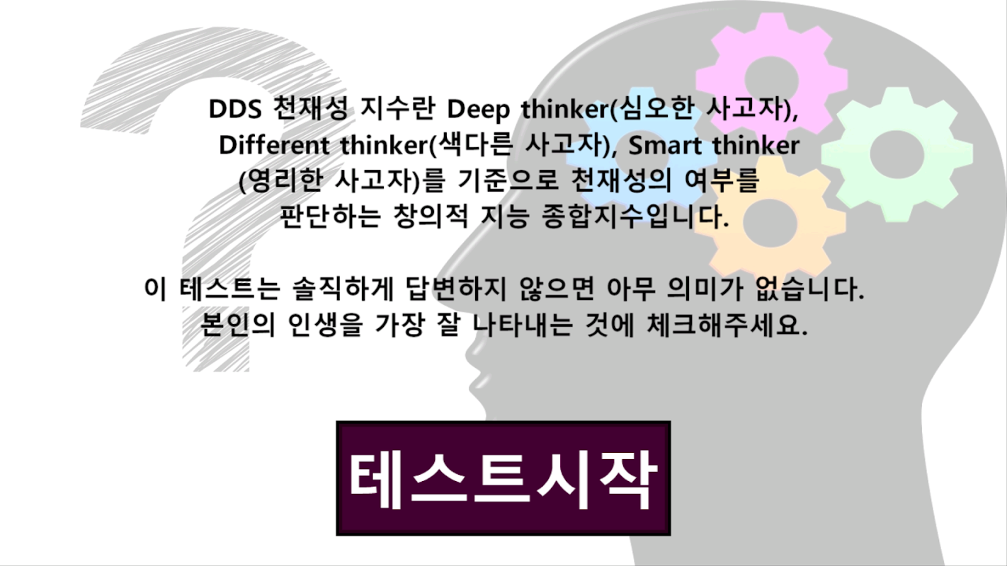 이 앱은 DDS 천재성 지수(Deep thinker, Different thinker, Smar thinker, 창의적 지능 종합지수) 를 기준으로