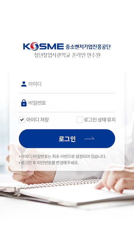 PC환경의 청년창업사관학교 온라인 연수원(http://kosmes.hunet.co.kr)의 아이디와 비밀번호로 로그인 가능하며, 주요 서비스를 본 모바일 앱에서도 사용하실 수 있습니다.