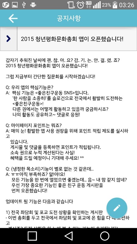 총회와 관련된 본부 공지사항을 확인할 수 있으며, 전국에서 실시하고 있는 ‘좋은친구운동’을 교류하는 SNS기능을 중점으로 이용할 수 있습니다.