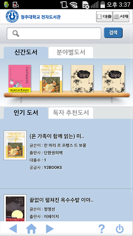 청주대학교 전자도서관의 도서이용 서비스를 스마트 폰에서 손쉽게 사용할 수 있도록 구성하였습니다. 도서의 검색에서 시작하여 도서 대출현황, 예약, 신청 등 도서관에서 이용할 수 있는 기능을 청주대학교 전자도서관 홈페이지를 접속하지 않더라도 스마트폰을 통하여 언제 어디서든지 이용할 수 있습니다