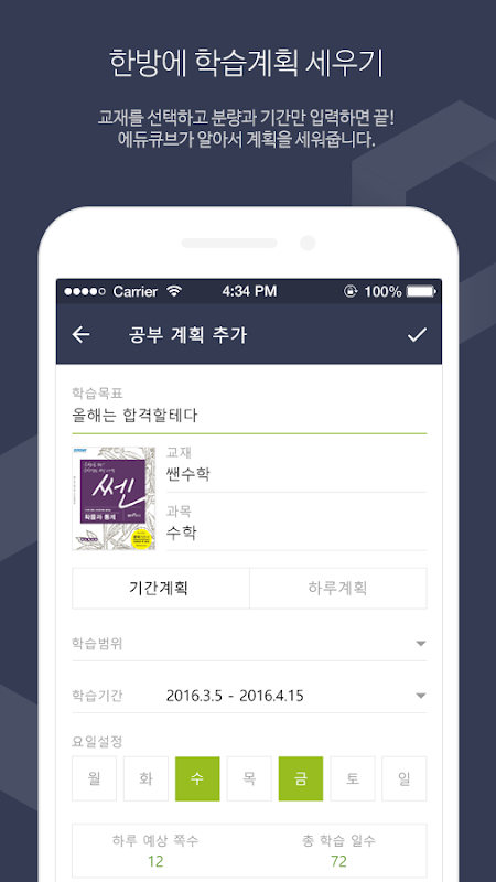 에듀큐브는 아주 쉽게 학습계획을 세우고 실천할 수 있게 해주며, 학습한 내용을 분석까지 해주는 똑똑한 학습플래너 입니다.