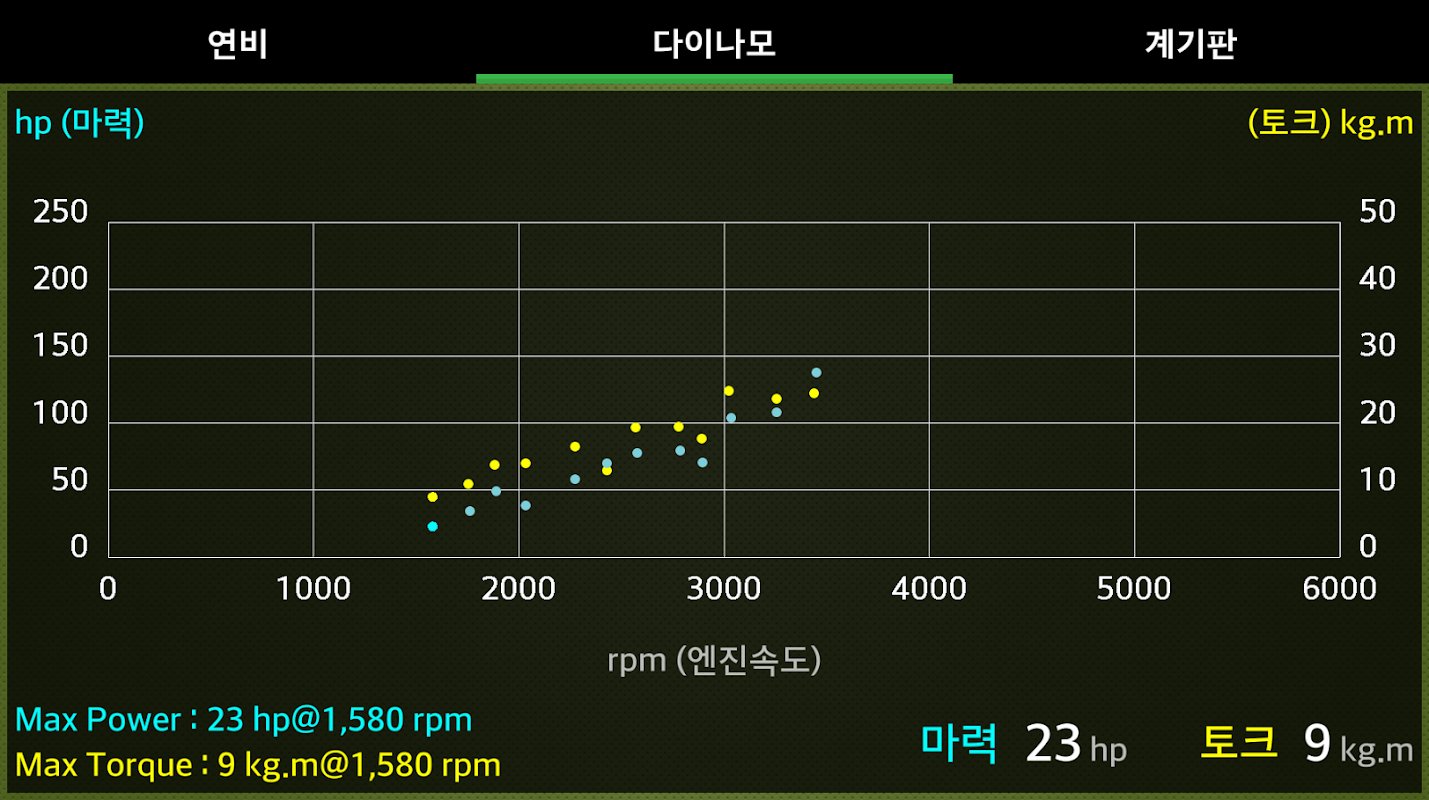 (3) 다이나모 그래프 : 주행 엔진속도별 마력 그래프, 토크 그래프, 최대 마력, 최대토크, 현재마력, 현재토크