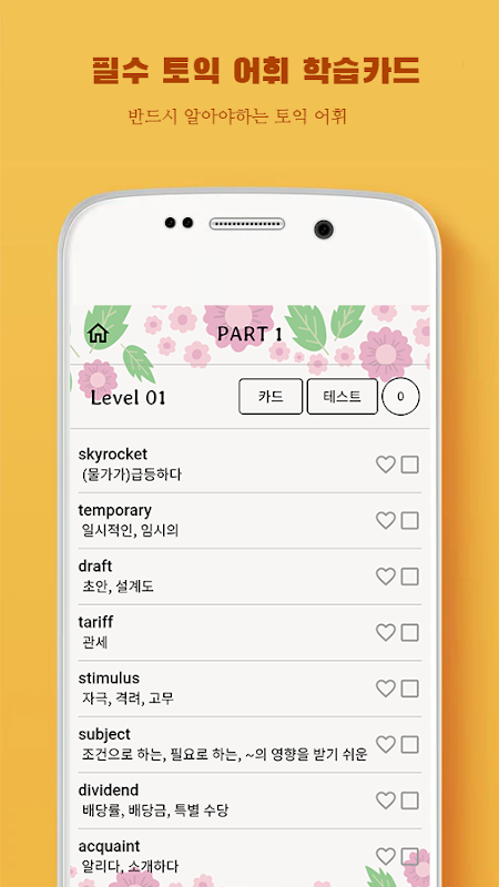 TOEIC 시험에서 등장하는 어휘 중 빈도가 높은 어휘를 쉽고 재미있게 암기할 수 있도록 도와주는 학습앱입니다.
