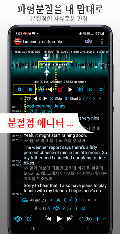 MP3 + M4A + MP4 dalga biçimini analiz edin, cümle birimlerini otomatik olarak bölümlere ayırın ve bunları gruba, bölüm tekrarına, bireysel gruplara göre seçmeli öğrenmeyi sağlayan dil tekrarı öğrenicisine göre yeniden sınıflandırın