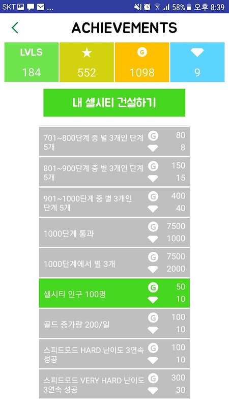 * 내 셀시티 건설: 나만의 멋진 셀시티를 건설해 보세요! 게임 진행에 도움이 됩니다.