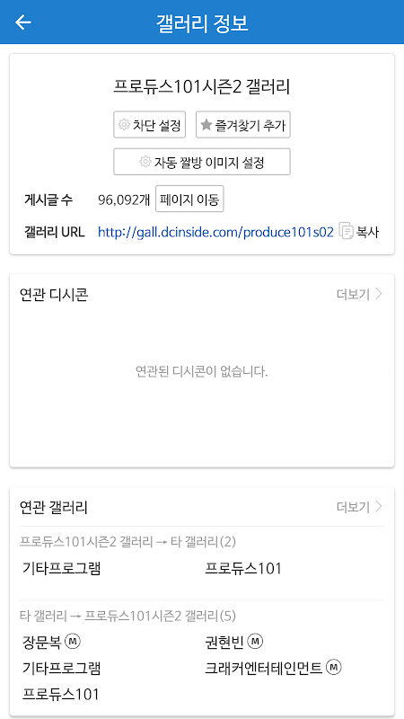 2. 연관 디시콘 : 프로듀스101시즌2 갤러리와 관련있는 디시콘을 갤러리 정보 화면에서 확인할 수 있습니다.
