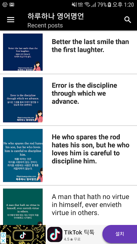 하루에 하나씩 전세계 명언을 영문으로 제공하며 그 명언에 대한 한글번역도