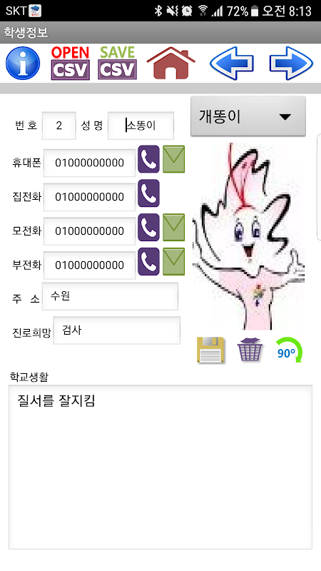 - 학생정보 기능은 학급 학생들의 사진, 연락처, 진로희망, 학교생활을 직접 입력하거나 엑셀파일로 작업한 후 일괄 불러오기하여 관리할 수 있습니다.