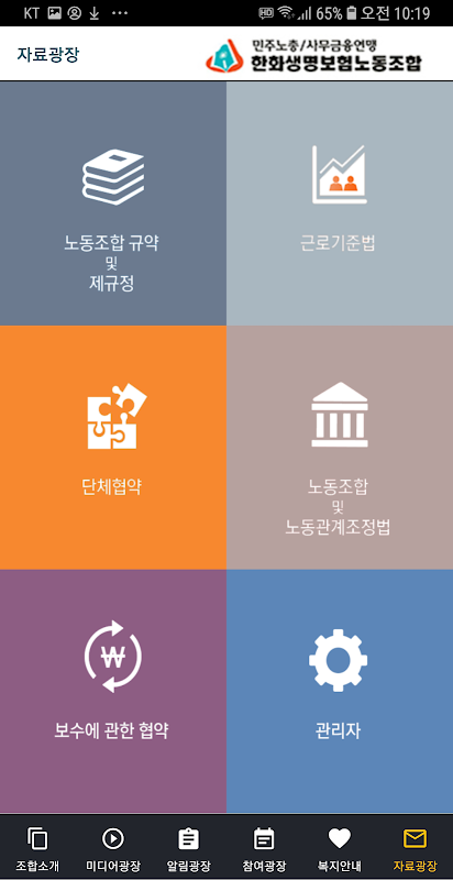 조합소개, 미디어광장, 알림광장, 참여광장, 복지안내, 자료광장등의 메뉴로 되어있는 본격 노동조합 어플입니다.