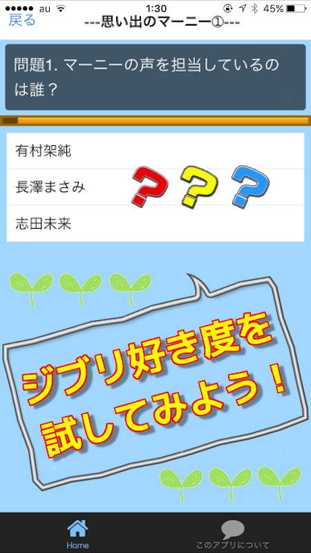 ジブリのクイズアプリです。全400問あり、簡単すぎない問題をご用意しましたので、とても楽しみながらクイズに挑戦していただけると思います♪♪
