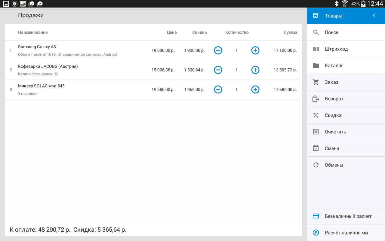 Обмен с информационной базой в on-line режиме оперативно обновит информацию о номенклатуре, продажах, сменах, внесениях и изъятиях денежных средств.