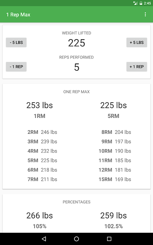 1RM also has a percentage chart for those who are doing workouts which require knowing the percentage of your 1 rep max.