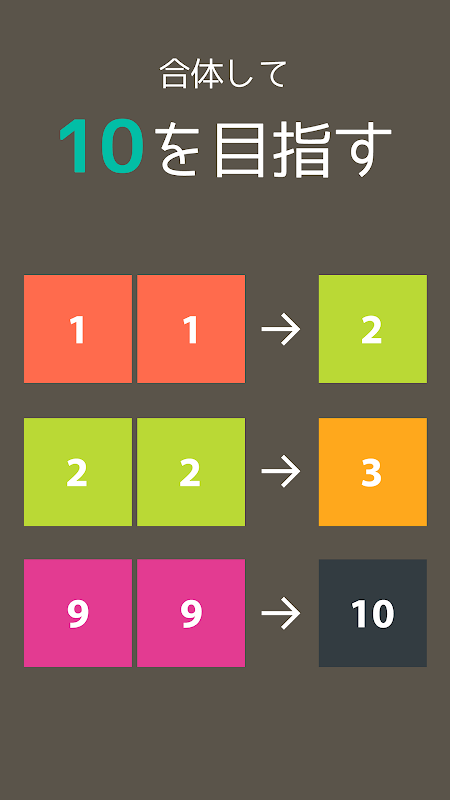 隣り合う同じ数字ブロックパネルをタッチして合体してどんどん大きな数字を作っていく、10に達成できたら成功です。