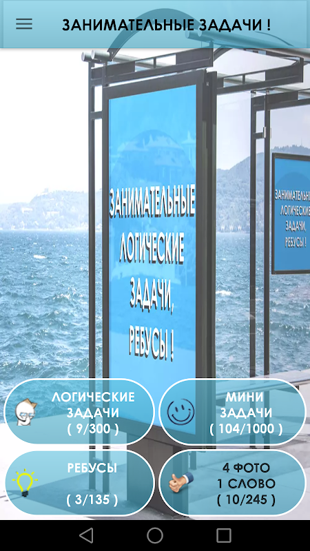 Логические задачи, 300 уровней. В разделе "Ребусы" 145 уровней. Добавлен раздел "4 фото 1 слово", 265 уровней.