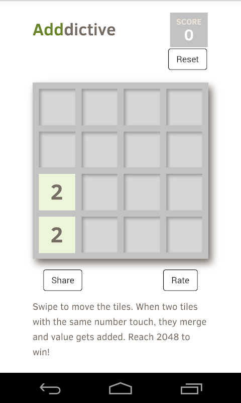 Swipe to move the tiles. When two tiles with the same number touch, they merge and value gets added. Reach 2048 to win!