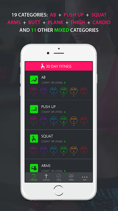 ► 8 egzersiz kategorisi: 30 Gün Ab, 30 Gün Şınav, 30 Gün Çömelme, 30 Gün Tonda Kol, 30 Gün Plank, 30 Gün Uyluk Zayıflama, 30 Gün Kardiyo.