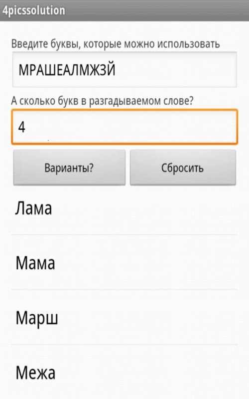 Вводите в приложение список имеющихся букв и длину слова, а в ответ - подходящие слова! Остается только пробежаться глазами по списку и ввести нужное.