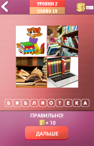 4 фото 1 слово - логическая игра-викторина для любителей интеллектуальных головоломок. Игра носит развлекательный характер, но и заставляет работать мозг. Ваша задача - угадать слово объединяющее 4 разных картинки на экране, а затем составить это слово из заданного набора букв. В игре 5 уровней по 20 слов-загадок. Если в процессе разгадывания возникли сложности вы всегда можете воспользоваться двумя подсказками. За подсказки снимаются баллы, за правильные ответы начисляются. 4 фото 1 слово - хороший способ проверить уровень ваших знаний, интеллекта и абстрактности мышления. Вам точно не будет скучно!