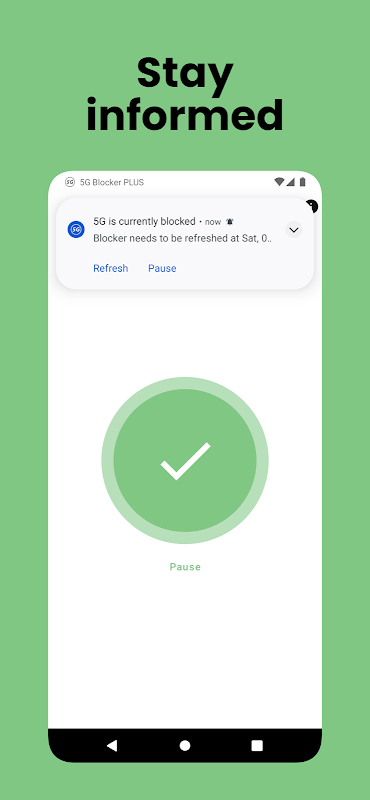5G Blocker PLUS kullanarak sağlığınızın artması (garanti edilmez) için yüksek bir şans vardır. Koruyucu bildirim yoluyla gösterilir. Sağlık korumasını duraklatmak istiyorsanız, bildirimi duraklatma seçeneği vardır. Daha sonra 5G korumasını yeniden etkinleştirmek mümkündür.
