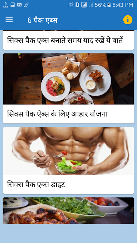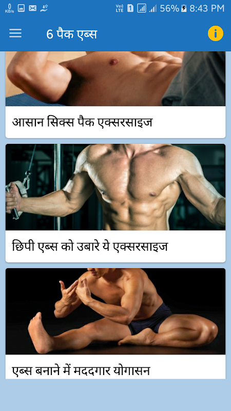 6 pack abs Hindi app has contents that follow the categories: 6 pack body kaise banaye, 6 pack abs workout, daily abs exercise,body building workout, baba ramdev yoga, 6 pack yoga asana.