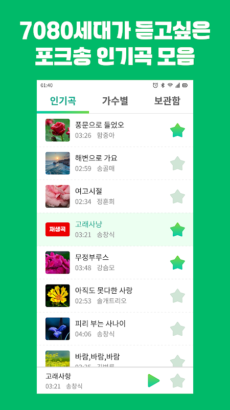 Nostaljik 7080 müzik kafede kendinizi eski anılara bırakın! 7080 Pop şarkıları, türküler, hafif müzik ve en yeni trot dahil olmak üzere çeşitli müzik türlerinin keyfini üye olmadan çıkarabilirsiniz. Yaşlıların bile kolayca kullanabilmesi için basit bir dokunuşla müzik çalmak için uygun bir konfigürasyon ve çeşitli işlevler sağlar.