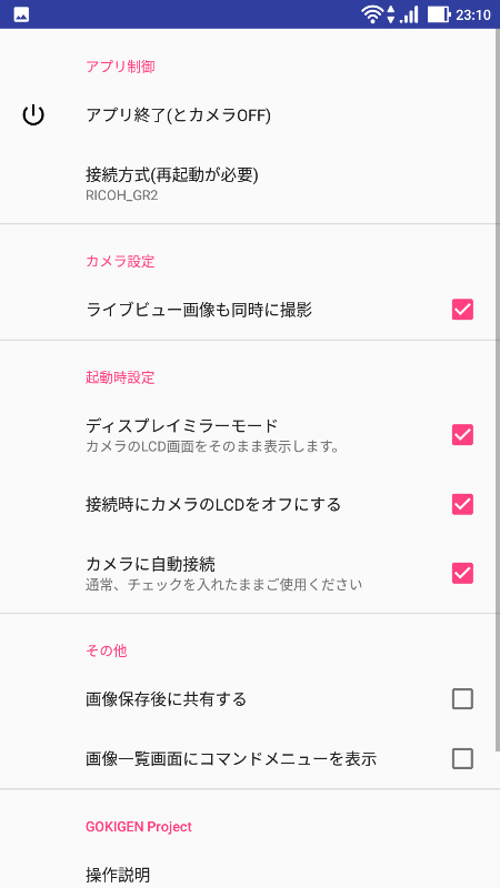 A01GR2, A01d'nin gelişmiş bir versiyonu olan RICOH GR serisi / PENTAX tek lensli kamera / FUJI X serisi / OPC (Olympus Air) için bir uzaktan kumanda uygulamasıdır.