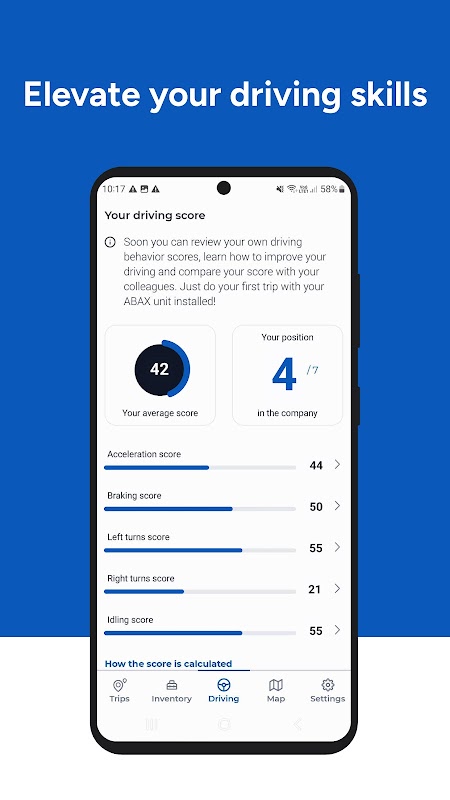 Nasıl daha iyi süreceğinizi öğrenin. Sürüş davranışı puanlarınızı gözden geçirebilir, sürüşünüzü nasıl geliştirebileceğinizle ilgili ipuçları alabilir ve puanınızı iş arkadaşlarınızla karşılaştırabilirsiniz. Aracınızdaki ABAX ünitesi, hızlı hızlanma, sert frenleme, keskin viraj alma ve aşırı rölantiyi tespit etmek için g kuvveti, hareket sensörü ve GPS kombinasyonu kullanır. Sürüşünüzün yeşil, güvenli, ekonomik olduğundan ve araç sağlığının korunmasına yardımcı olduğundan emin olun.