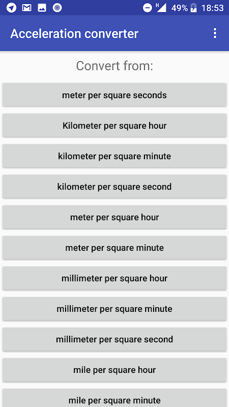 Use this useful tool to convert acceleration choosing one of the 21 units of measurment included in this app, that are: