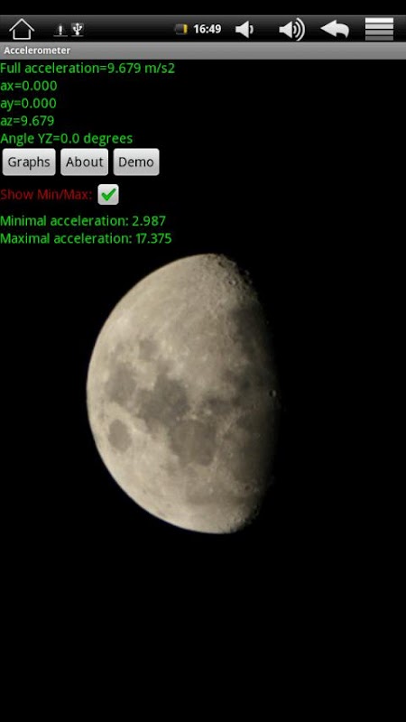 Now added new possibilities: program may show maximal and minimal acceleration of device and vertical level demonstration using picture. Version 1.2: write data possibility added. Press yellow square for acceleration recording. Square will stay red. For finish recording press red square.