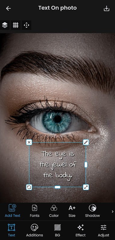 Metin Ekle, fotoğraflara metin eklemeyi, alıntılar, memler, fotoğraf başlıkları veya yaratıcı tipografi tasarımları oluşturmayı kolaylaştırır. Bu Fotoğraftaki Metin Uygulaması, modern bir arayüze sahip ancak kullanımı kolay, güçlü, hepsi bir arada bir fotoğraf metin düzenleyicisidir.