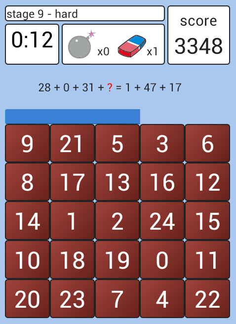 Find in the matrix the suitable number to complete the sum. In each stage, you have to find ten numbers (except in difficulty level "beginner", where you just have to find seven numbers) before time gets to zero. As you progress in the game, the size of the matrix and the number of sums increases.