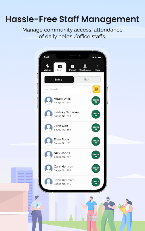 Bir Konut Topluluğundaki Güvenlik Yönetiminin her yönü için işlevselliğe sahiptir - Ziyaretçi Yönetimi, Ev Personeli Yönetimi, Dernek Personeli Katılımı, Park Yönetimi, Acil Durum Yönetimi, Malzeme Giriş-Çıkış Yönetimi, Kulüp Binası Erişim Yönetimi.