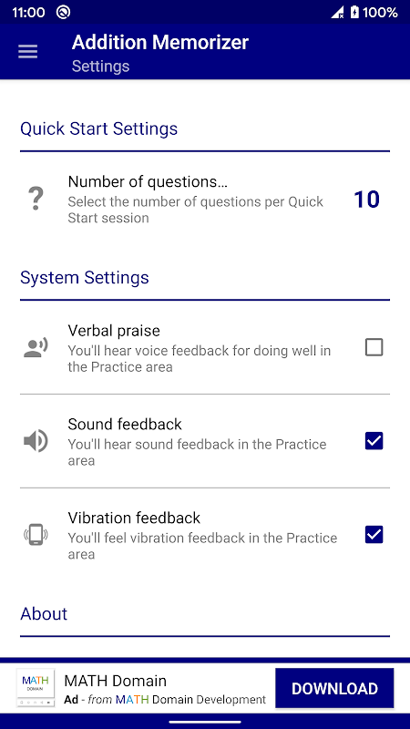 Uygulama , ek ezberlemenizin test edildiği yerdir. Sorular rastgele oluşturulur. Cevabı basamak basamak girmek sizin işinizdir (çoktan seçmeli yoktur). Her ekleme olgusu için doğru ve yanlış girişimlerin sayısı izlenir ve kaydedilir. Her oturumun sonunda yanlış sorunlar listelenir ve tüm soruları tekrarlama, yalnızca yanlış girişimlerde tekrar etme veya soruları bir arada karıştırma seçeneğiniz vardır.