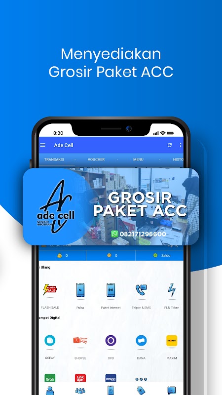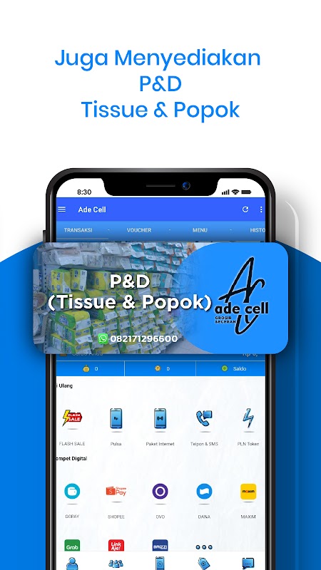 Ade Cell android uygulaması, nerede olurlarsa olsunlar Ade Cell'in sadık üyeleri için ücretsiz bir mobil uygulamadır. Bu uygulama, bakliyat yükleme, elektrik jetonları satın alma, PPOB vb. gibi çeşitli işlemleri gerçekleştirmenizi kolaylaştırır.