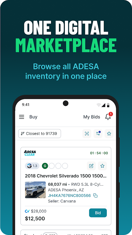 Tüm ADESA satış kanallarındaki envanteri bulun! Haftanın herhangi bir günü ADESA Clear zamanlı dijital açık artırmalarında 7/24 teklif verin ve 56 lokasyonumuzdan birinde günlük canlı satışlara katılın veya ADESA Simulcast'ta açık artırma listelerini görüntüleyin - hepsi tek bir optimize edilmiş uygulamada.