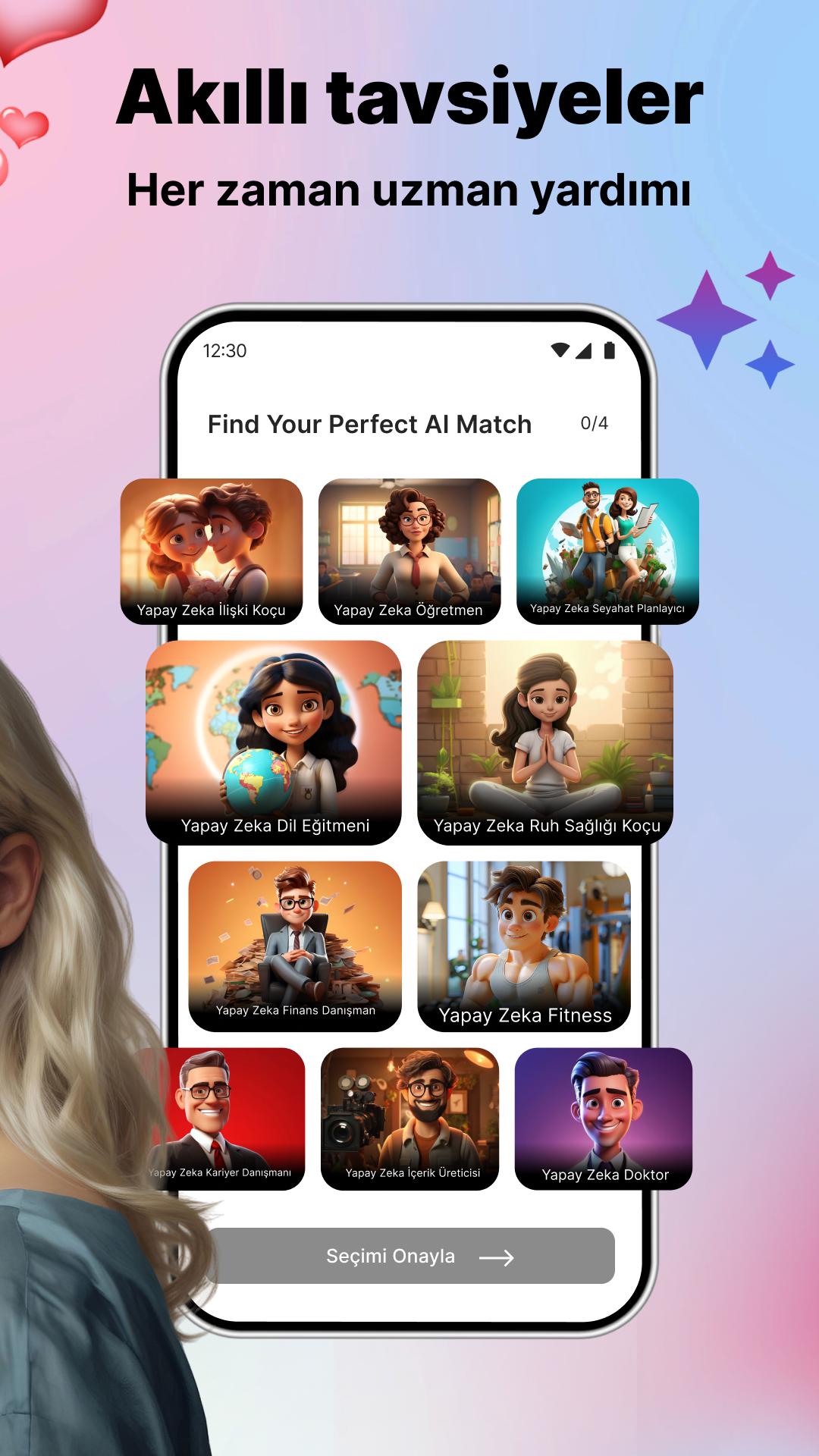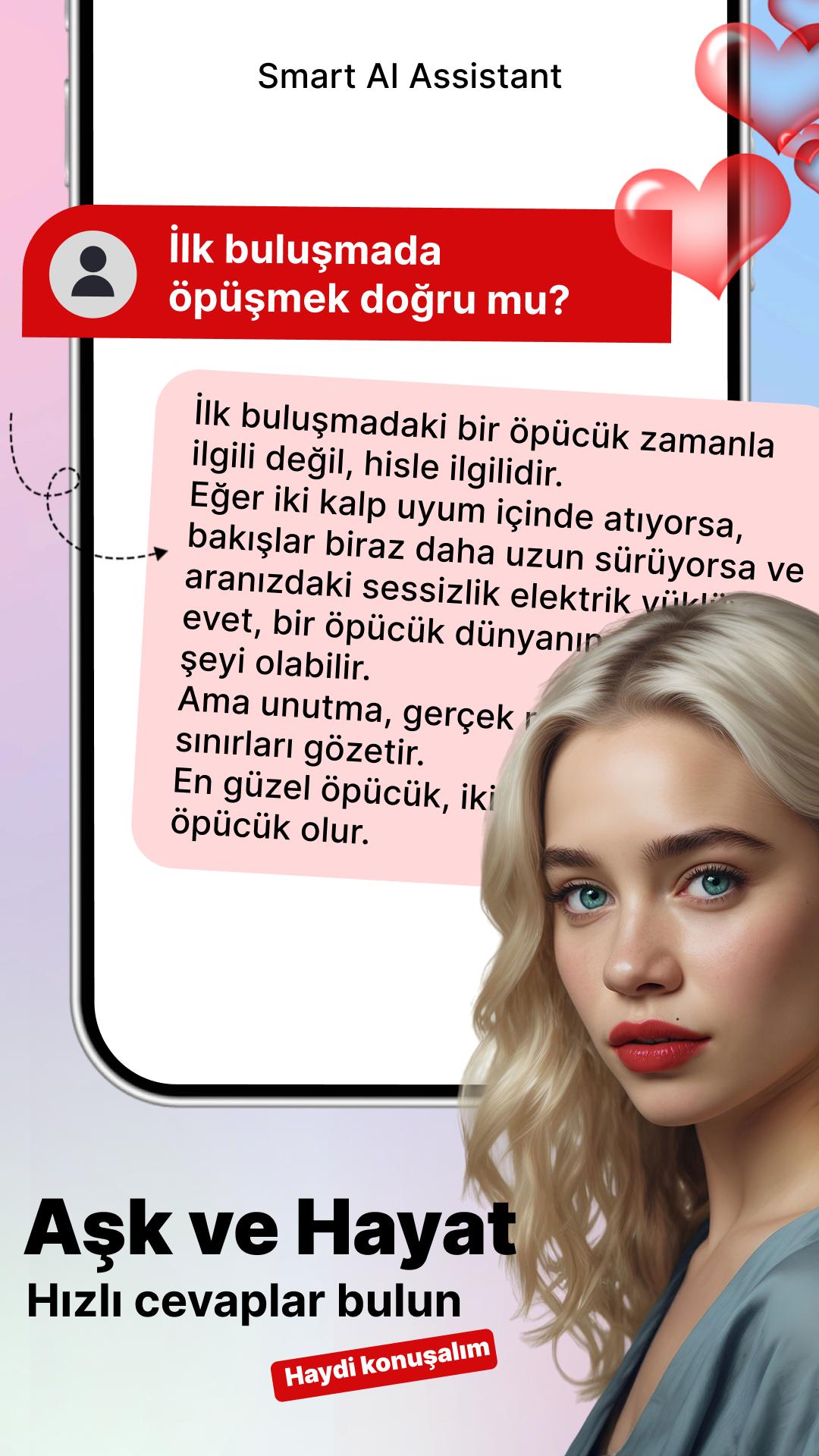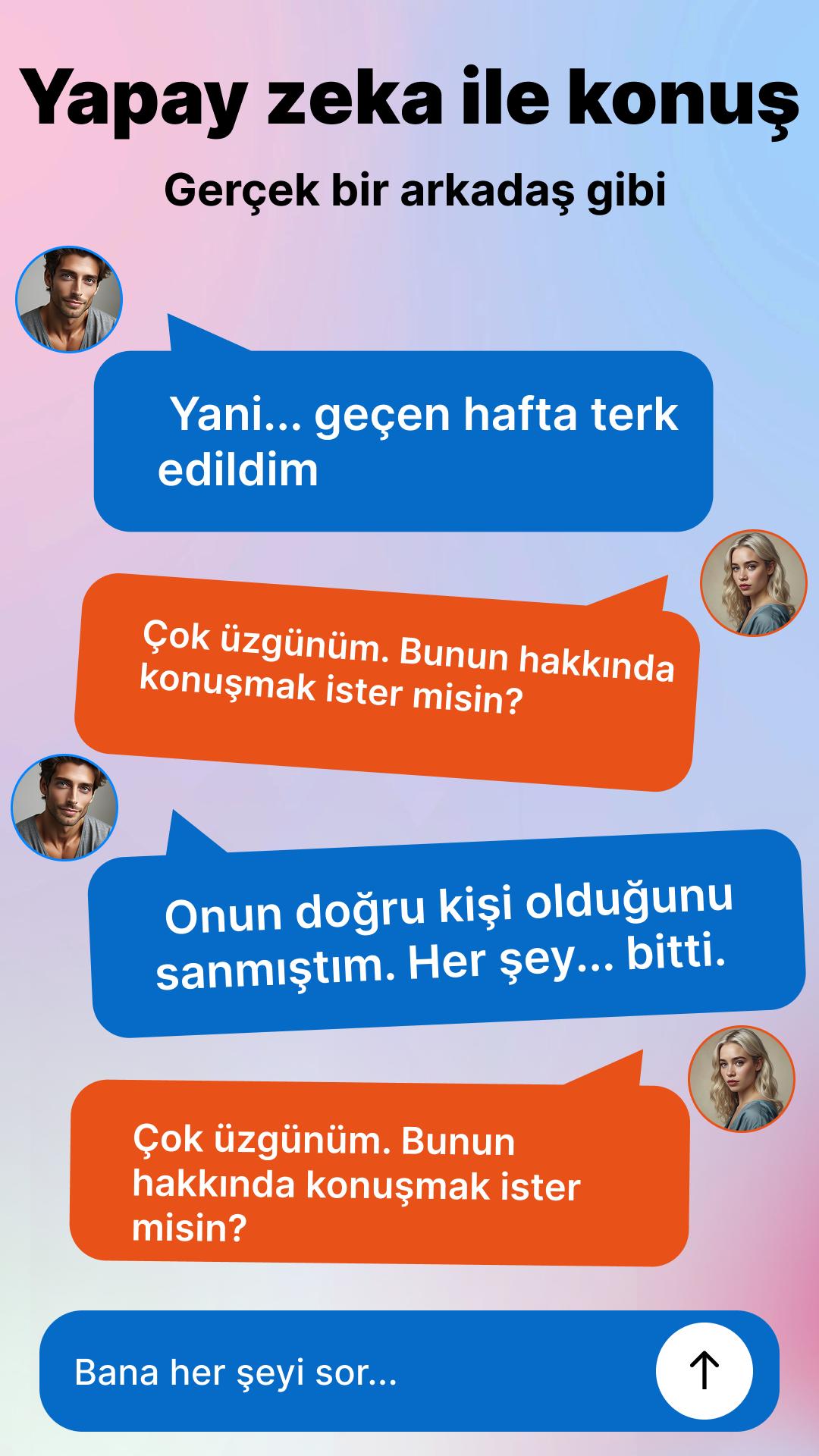 İlişkilerinizi güçlendirin! İster flört tavsiyeleri, ister çatışma çözümü veya iletişim ipuçları olsun, Yapay Zeka Danışmanı yapay zeka uygulamamız anlamlı bağlantılar kurmanıza yardımcı olur.