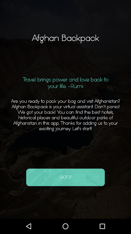 The first application developed by the Afghan female coders, for tourists who like to visit Afghanistan. Find the hotels, restaurants, historical places, and parks in four major cities, and read the provided information about every site.