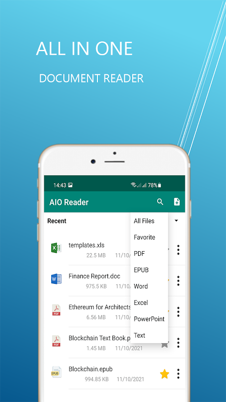 AIO Reader (All-In-One Reader) is an All Documents Reader. You can edit and view PDF files with PDF Editor, read and view MS Office files: Word, Excel, Power Point files. AIO Reader is also an EPUB Reader. You can read EPUB ebooks with AIO Reader: All Documents Viewer. All Document Reader: PDF, excel, word, EPUB, Documents is offering features of reading multiple Documents including EPUB reader, PDF Reader, PDF Editor, Docs & Docx Reader, ppt reader, xls reader, txt, excel & other document reader.
