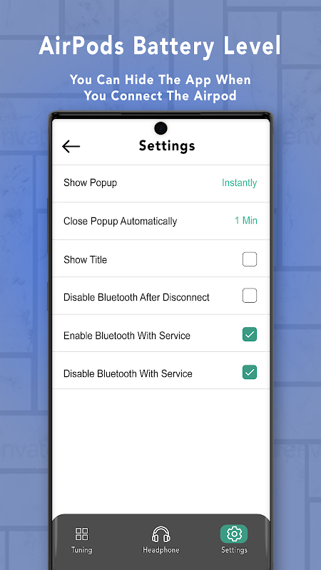 Airbuds Popup : PodsBattery, kullanıcının kulaklığı telefona bağlandığında açılır bir pil arabirimi görüntüler. Aynı zamanda pil, bildirim çubuğunda, durum çubuğunda, masaüstü widget'larında ve hızlı ayarlarda kontrol edilebilir.