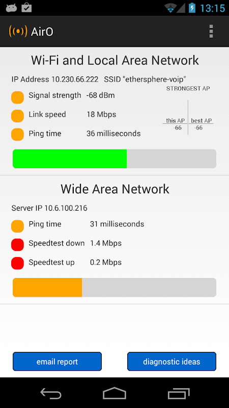 AirO, Wi-Fi özellikli Android cihazların teknik ve fazla teknik olmayan sahiplerine yöneliktir. Wi-Fi (“Yerel Alan”) bağlantısının sağlığını görüntüler ve ağın daha derinlerindeki bir sunucuya “Geniş Alan” bağlantısının özelliklerini ölçer. Aşağıdaki gibi soruları cevaplamak için kullanılabilir:
