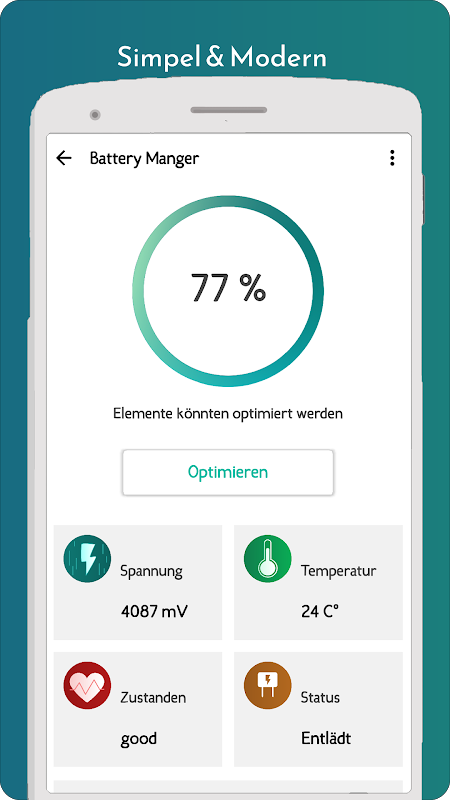Optimieren Sie ihren Akku nur mit einem Klick um, Akku zu Sparen. Bei der "Ein Klick Optimierung" wird der Akku so Optimiert das Sie eine lange Lebensdauer & Besser Leistung erzielen.
