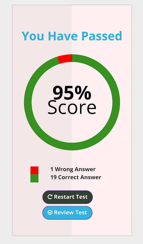 In this app Every test have 20 questions you need 17 Marks to pass.