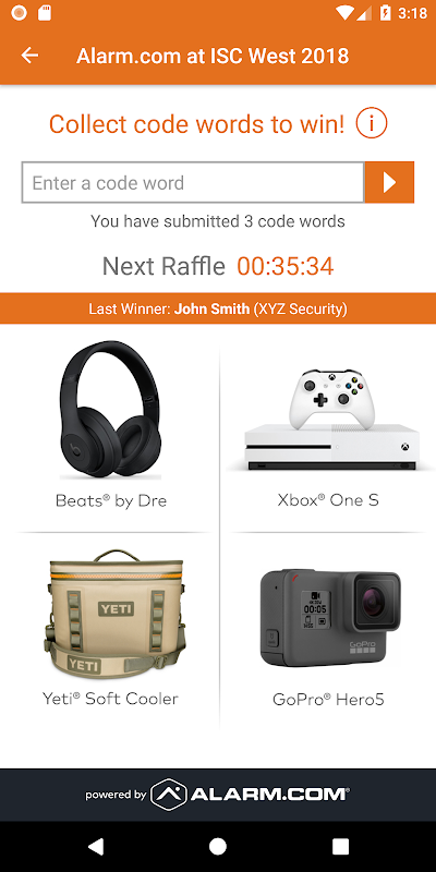 The Interactive Raffle app, powered by Alarm.com, allows attendees of the 2018 ISC West Conference in Las Vegas to submit code words from the Alarm.com team for submissions to our interactive raffle!