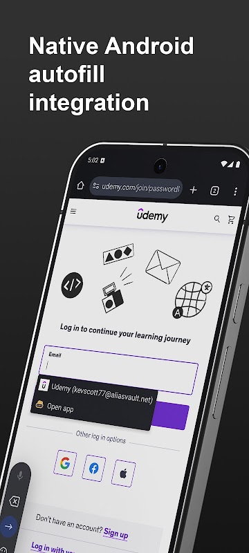 Android için AliasVault, hareket halindeyken parolalarınıza ve e-posta takma adlarınıza güvenli bir şekilde erişmenizi sağlar. Android'in yerel otomatik doldurma özelliği sayesinde, kopyalamaya gerek kalmadan doğrudan web sitelerinde takma adlar oluşturun ve kullanın.