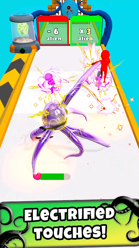 Ama hepsi bu değil! Çeşitli geçitlerden ve engellerden geçtikçe uzaylınız özel güçler kazanacaktır. Buzlu arazilerle karşılaşın ve donmanın gücünden yararlanın veya size heyecan verici yetenekler kazandıran elektrik şoklarına meydan okuyun. Uzaktaki avı yakalamak için uzaylınızın uzuvlarını uzatın ve insanları son derece hızlı bir şekilde yutmak için geçitlerden geçin.