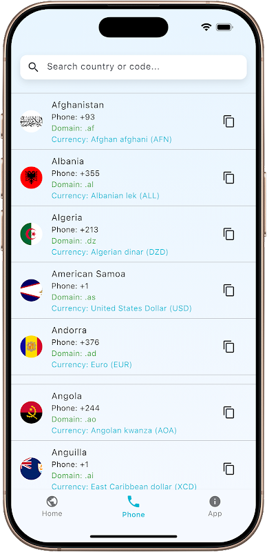 Ülke kodlarını, telefon kodlarını, saat dilimlerini ve para birimi ayrıntılarını hızla bulun